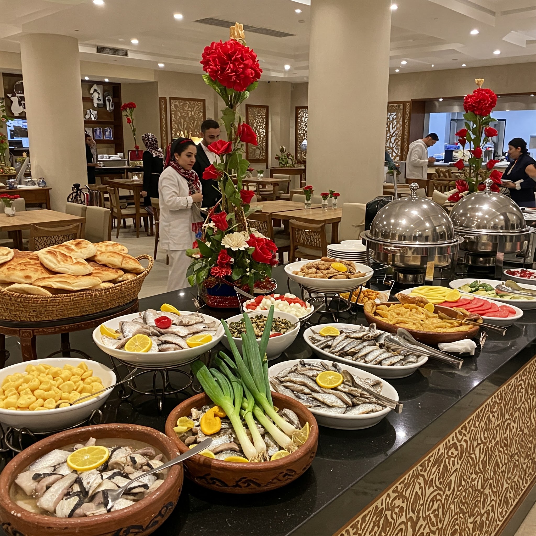 إفطار تقليدي مميز يشمل رنجة، فسيخ، سردين، بصل أخضر — أجواء أصيلة ولمسة من الذكريات الجميلة لعشاق رأس البر.